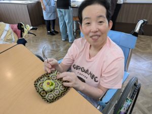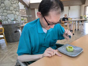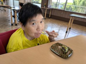 茶道クラブ 2024年8月12日 夢の家 本日のお菓子は『ひまわり』 可愛い〜(≧▽≦) 食べちゃうのは惜しいけど・・・ ぱくっ! ひまわりを前にして ひまわりのような笑顔 意を決して・・・いただきます