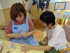 ★Masa夢 ネイルの時間❤ 2024年9月26日 Masa夢 毎月、おしゃれ週間があります。 体重測定、爪切り、ネイル💅 ご希望あれば鼻毛のお手入れも👃 ネイル中のご利用者を発見!! かわいくなって、嬉しいね~(*’▽’)